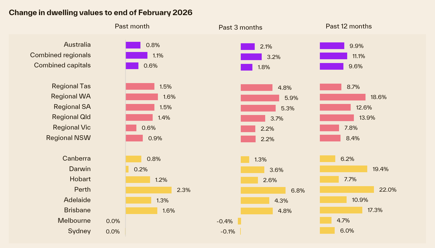 - Regional and affordable markets are outperforming. Combined regionals rose 11.1% annually versus 9.6% for combined capitals, with demand supported by lower price points and rising internal migration. Within capital cities, the more affordable end of the market is also holding up strongest. In Sydney, lower quartile house values rose 0.8% in February, while upper quartile values fell 0.9%, a pattern consistent across most cities as serviceability constraints limit competition at higher price points.