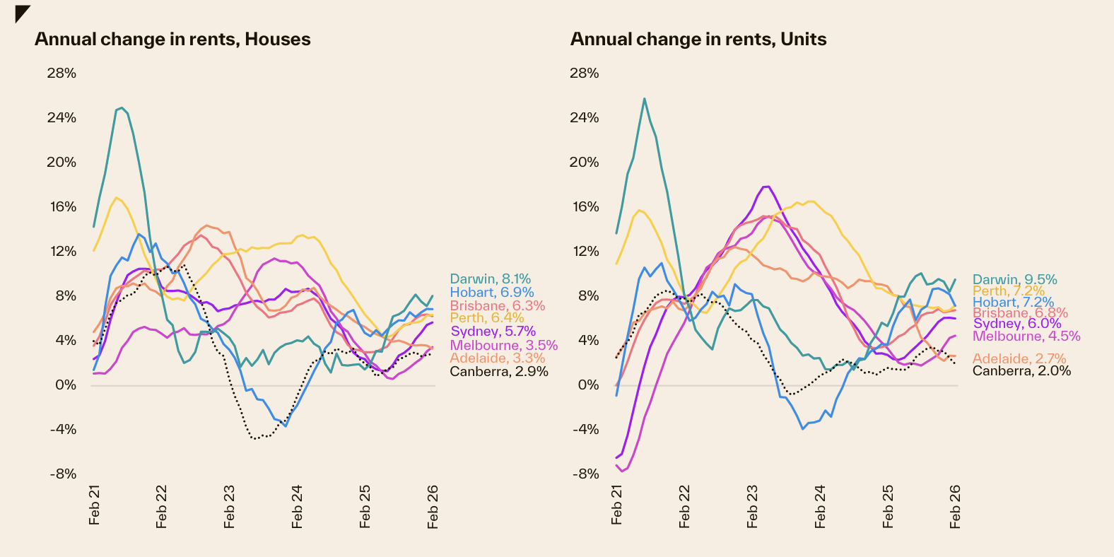 - Vacancy rates remain tight: National vacancy rates sit at around 1.5%, according to Cotality’s March 2026 Housing Chart Pack. While some apartment markets have seen additional supply come online, helping to moderate unit value growth, overall rental supply remains insufficient to meaningfully ease competition for tenants across most capital cities.