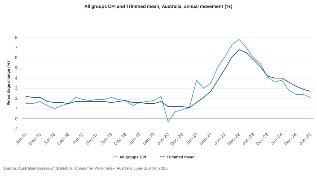 The RBA’s preferred measure – the trimmed mean inflation rate – also declined, falling from 2.9% to 2.7%, a three-and-a-half-year-low, and just a touch above the central bank’s 2.6%  forecast from May. These results confirm that inflation is returning to the RBA’s target band, offering long-awaited relief for borrowers and the broader economy.